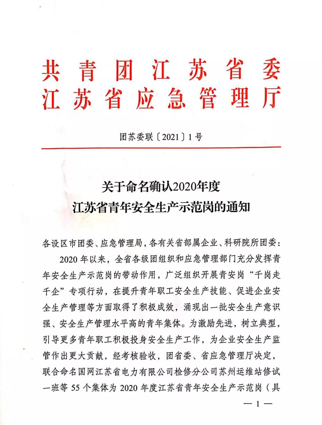 據了解,“2020年度江蘇省青年安全生產示范崗”是團省委和省應急管理廳聯合開展的一項創建活動,旨在激勵先進、樹立典型,引導更多青年職工積極投身安全生產工作。